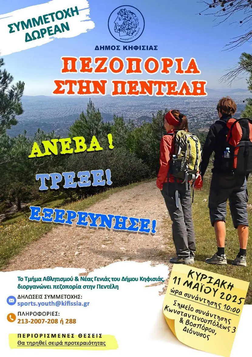 To Τμήμα Αθλητισμού & Νέας Γενιάς του Δήμου Κηφισιάς σας καλεί την Κυριακή 11 Μαΐου 2025 για πεζοπορία στην Πεντέλη!...